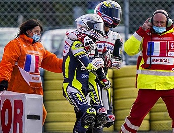 Jedna od najupečatljivijih slika sa Moto 3 trke, održane u nedelju na Le Mansu, je bio zagrljaj kolega iz Sterligarda Max Racing tima nakon incidenta i pada koji ih je obojicu izbacio iz takmičenja.