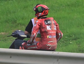 „Upoređujem današnji pad sa onim na Misanu 2021. Tamo sam bio primoran da pobedim i da bih to uradio morao sam da stavim tvrdu gumu, čak i ako nije bila tako visoka temperatura. Jedini način je bio da snažno forsiram i samo pred ulazak u Querciu kočim mekše. Tada sam pao. Danas je bilo manje-više isto. Ipak, ja ću uvek prvo sebe okriviti kada padnem. Samo u Barceloni nisam mogao ništa da uradim da sprečim incident. Danas je apsolutno moja krivica“, izjavio je Bagnaia i dodao: